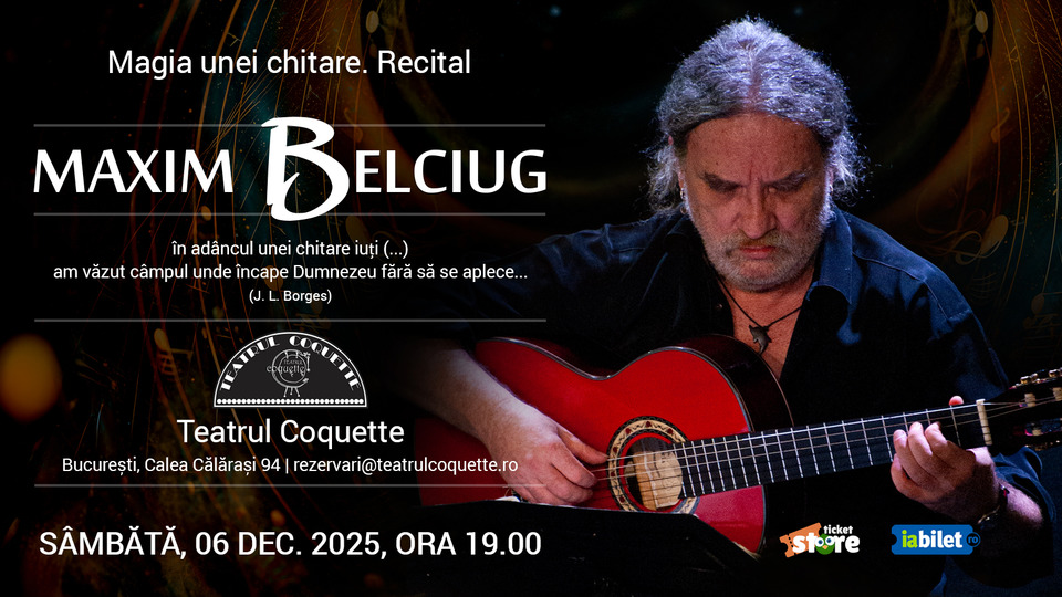 Ultimul concert de chitară din 2025 are loc chiar în ziua de Sf. Nicolae, respectiv sâmbătă, 6 decembrie, ora 19:00, în spațiul intim și elegant de la Teatrul Coquette. Protagonistul serii este binecunoscutul Maxim Belciug, cel supranumit adesea "cea mai solo chitară solo". Cu stilul său unic de a decanta emoția în muzică, artistul va transforma seara într-o întâlnire de neuitat cu magia chitarei. Partituri de virtuozitate ale creației clasice și delicate opere romantice se vor împleti fabulos cu pași de vals și tango, ritmuri de tarantelă, bolero sau cadențe vii de flamenco, într-un spectacol solistic ce pune în scenă extraordinara paletă de posibilități expresive ale chitarei. O muzică închinată frumuseții și care "se încăpățânează să sune altfel decât cea izvorâtă din trecerea mai mult sau mai puțin ritmată a arginților sunători dintr-o mână în alta", așa cum spune însuși Maxim Belciug.