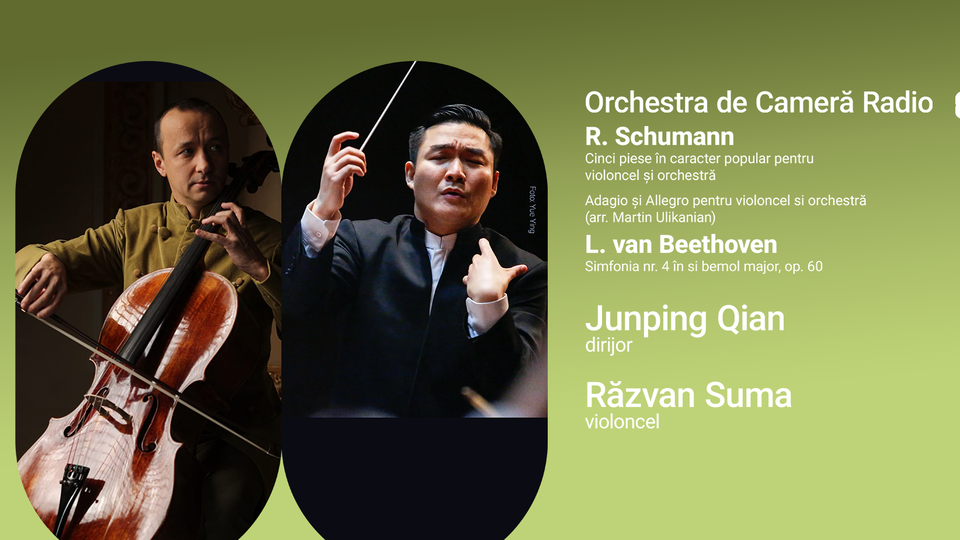 Concertul Orchestrei de Cameră Radio. Dirijor: Junping Qian. Solist: Răzvan Suma - violoncel. Robert Schumann - Cinci piese în caracter popular pentru violoncel și orchestră și Adagio și Allegro pentru violoncel si orchestră (arr. Martin Ulikanian); Ludwig van Beethoven - Simfonia nr. 4 op. 60 în si bemol major. Comentează Corina Rădoi. Preluare de la Radio România Cultural