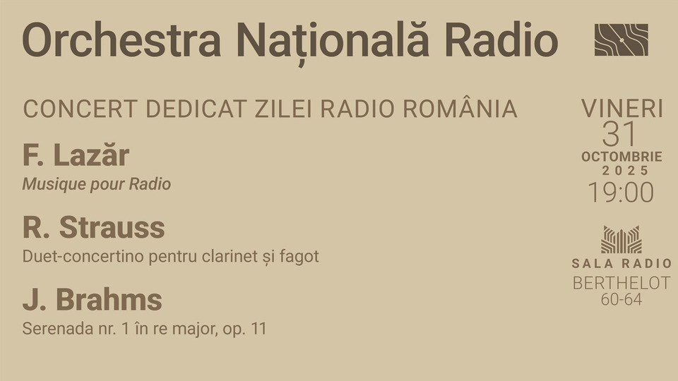 Concertul Orchestrei Naționale Radio. Concert dedicat Zilei Radio România. Dirijor: Cristian Oroșanu. Soliști: Adrian Duminică - clarinet, Ionuț Roșca - fagot. Filip Lazăr - Musique pour Radio; Richard Strauss - Duet-concertino pentru clarinet si fagot; Johannes Brahms- Serenada nr. 1 în re major, op. 11. Comentează Cristian Marica. Preluare de la Radio România Cultural
